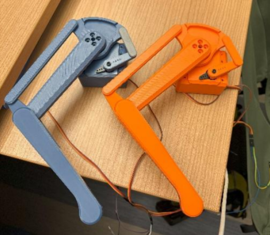 A close-up of the 3D-printed leg mechanics, built to house hobby servos for articulation.